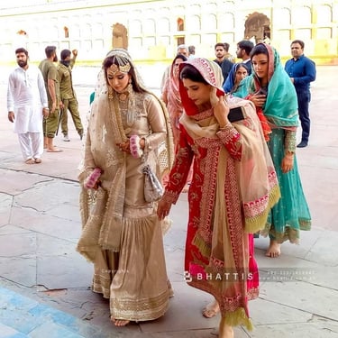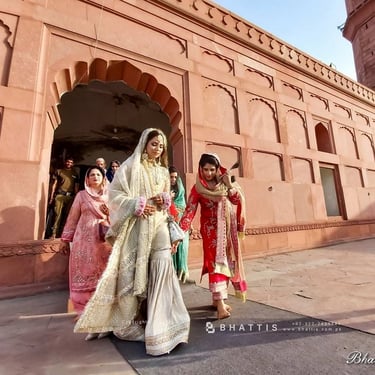 Following the nikkah at Badshahi Mosque, the newlyweds proceeded to nearby Hazoori Bagh for a captivating photo shoot. This lush, historic garden, located between the Lahore Fort and Badshahi Mosque, epitomizes a blend of nature and ancient architecture. The garden's captivating scenery, adorned with fountains, manicured lawns, and historic structures, created an enchanting setting for their wedding photoshoot. Every snapshot taken at Hazoori Bagh encapsulated the joy and love emanating from the newly married couple.